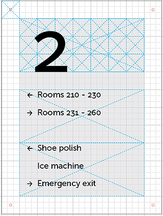 Bir yönlendirme sisteminin birlikte ve doğru şekilde çalışması için, tabelaları farklı boyutlarda ölçeklendirmek için bir tasarım ızgarası kullanılır. Örnek tasarımda, 9’luk bir alt bölmeye sahip 30 mm’lik (milimetre) bir taban ızgara kullanıldı. Örneğin tüm ölçümler 9×9 bölmesine dayanıyor. Tek bir işarete çok fazla bilgi göstermemeye dikkat edilmeli, bu kolayca göz ardı edilebilir, bunun yerine iyi yol bulma sonuçları elde etmek için çoklu işaretler kullanılmalıdır.